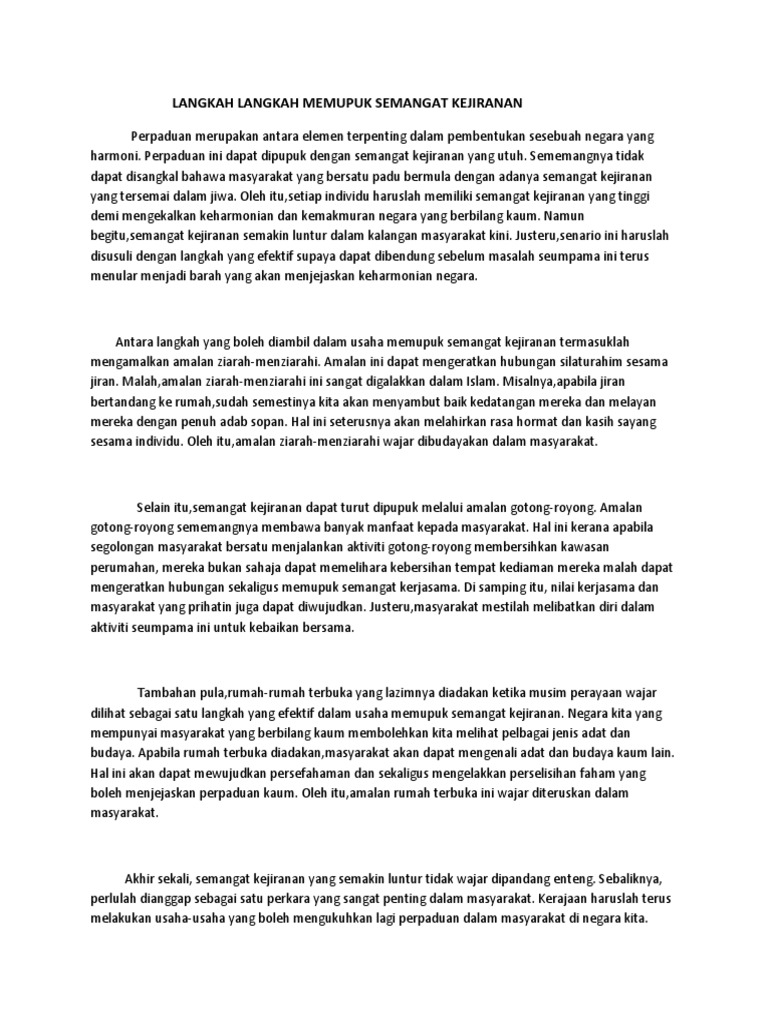 Pada pendapat anda apakah langkah-langkah yang harus diambil supaya semangat kejiranan. Contoh karangan spm memupuk semangat kejiranan dalam kalangan masyarakat Jiran ialah orang yang tinggal di sekeliling rumah kita iaitu di sebelah di hadapan dan juga di belakang rumah kita. Usaha memupuk semangat kejiranan dalam kalangan remaja.